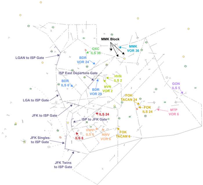 - LGA must vector departures filed below 10,000' through the LGA to ISP Gate (LGA refers to this gate as "ISP Departure Gate") on a track from 060-080, and ensure aircraft are at 7,000' or 8,000' 1.5nm prior to the LGA/ISP boundary.