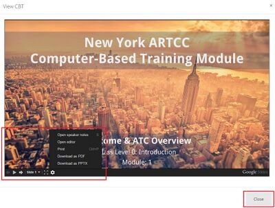 Controls Controls include arrows for progression, a drop-down menu for selecting slides, a button to expand to full-screen mode. Additionally, a button at the bottom closes the CBT window. When viewing CBTs, we highly suggest you do NOT use the arrows to progress forward, rather click anywhere within the slide to progress to the next slide.