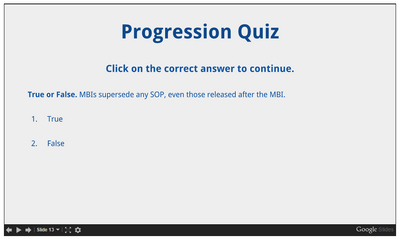 During the course of a CBT, you may encounter a progression quiz. These quizzes are NOT graded, but simply exist to test your knowledge on the material covered in the respective CBT. These quizzes are for your benefit, so take them seriously.