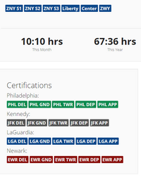 • ZNY certification levels for each controller are indicated on the ARTCC Roster, and specific position certifications (e.g., Kennedy Approach, Newark Departure, LaGuardia Ground, etc.) can be found on the controller profile page (see the image to the right).